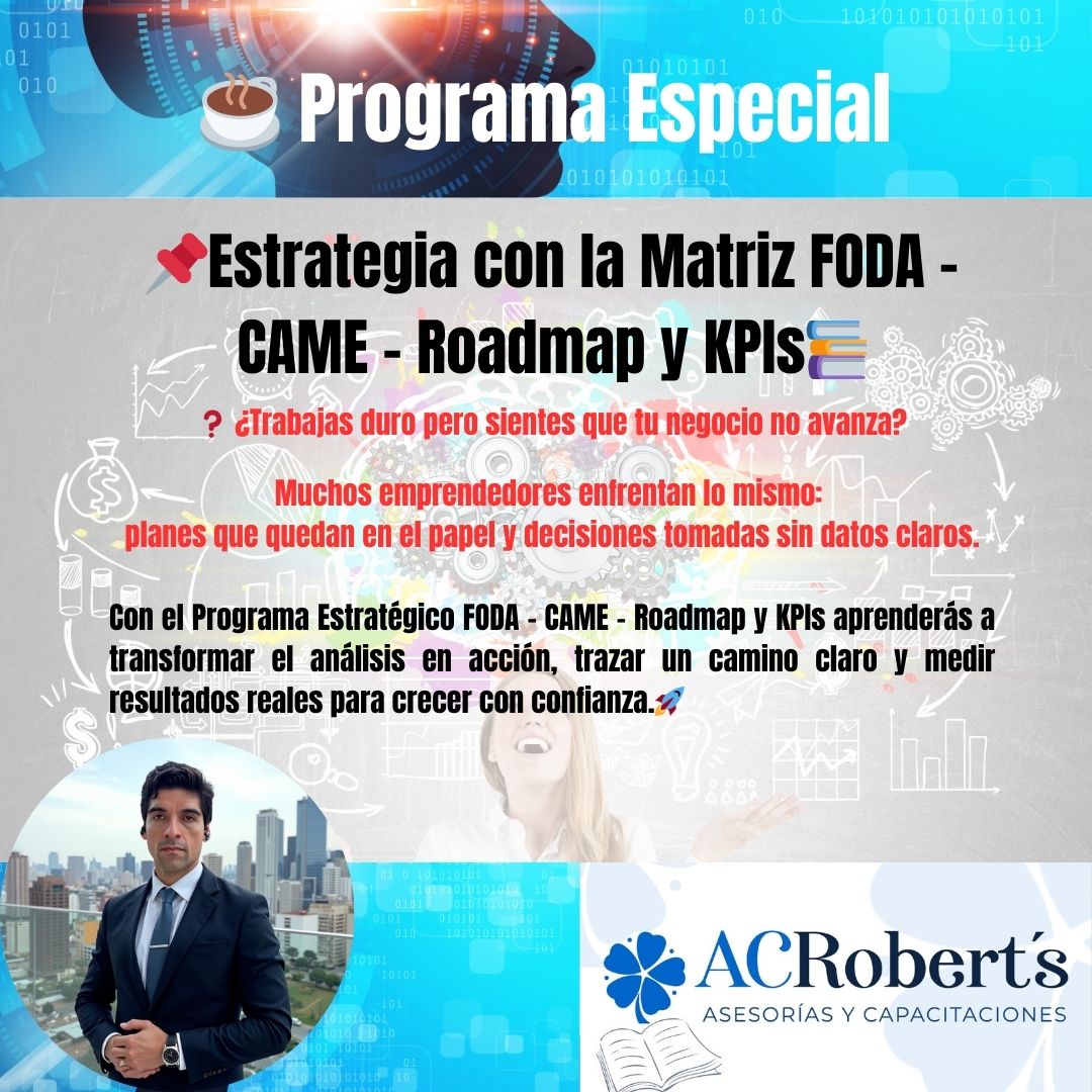 Con la combinación de Matriz FODA, metodología CAME, Roadmap y KPIs, aprenderás a identificar fortalezas y debilidades internas, evaluar oportunidades y amenazas externas, y convertir ese diagnóstico en estrategias aplicables y medibles.